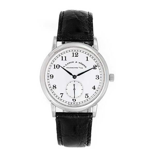 The A Lange & Sohne 1815 206.025 features 35.9mm platinum case, 7.5mm thickness, silver dial, fixed bezel, scratch resistant sapphire crystal, power reserve 45 h, 21 jewels, manual winding movement, tang buckle clasp, black leather strap, transparent case back.