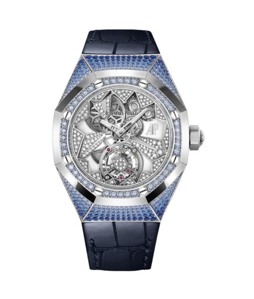 The watch is housed in an 18-carat white gold case that measures 38.5 mm, a perfect size for a modern man’s wrist. The case is embellished with brilliant-cut graded blue sapphires, which add a striking visual appeal. Complementing this gem set bezel is the crown, adorned with a translucent sapphire cabochon. The use of white gold and sapphires signifies sophistication and robustness.