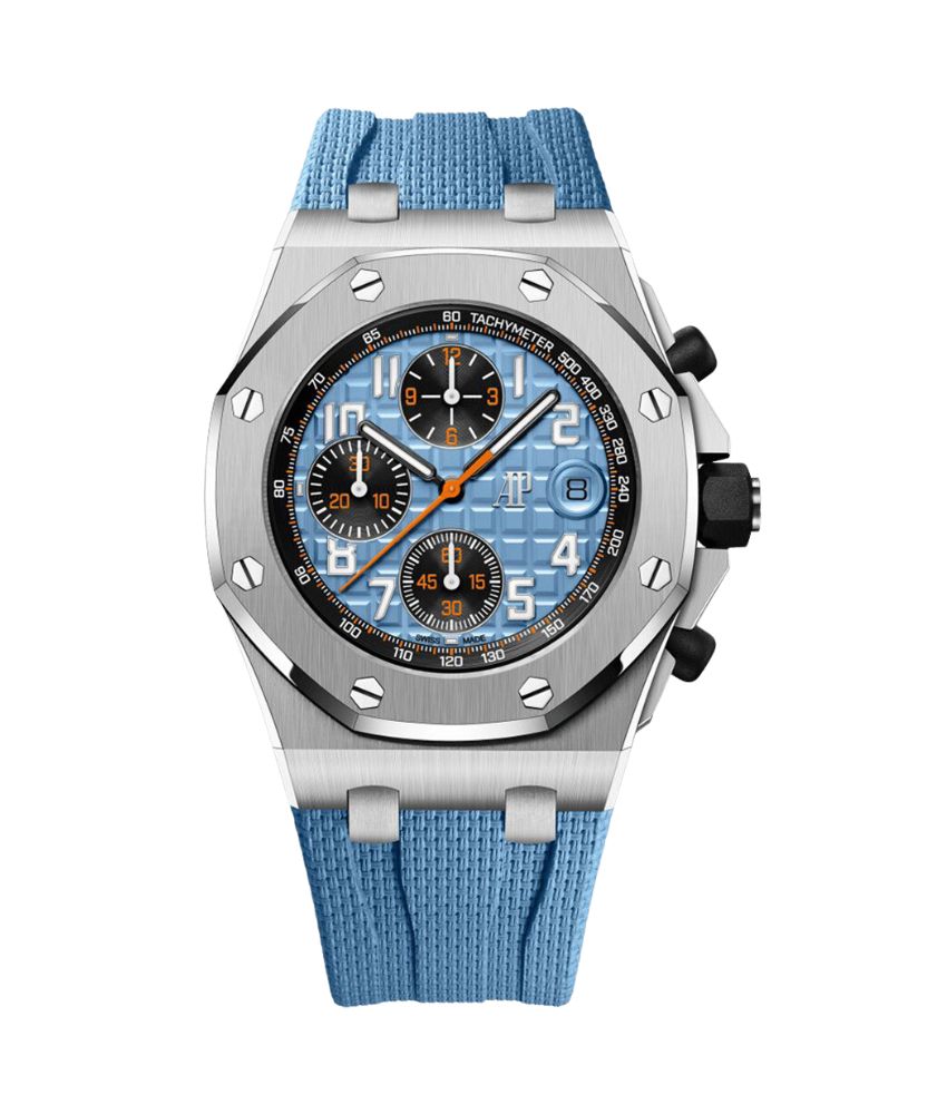 To add to its stunning visual appeal, the watch comes with a blue rubber strap that has a textured decoration. The stainless steel AP pin buckle ensures a secure and comfortable fit. Moreover, the strap is interchangeable, giving you the freedom to customize the look as per your preference. An additional black calfskin strap is also included.
