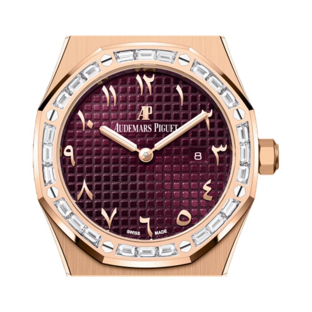 One of the standout features of this Royal Oak watch is its striking purple dial. The purple hue is deep and rich, making it both unique and captivating. What makes it even more special is the use of Eastern Arabic numerals on the dial. These numerals add a touch of culture and uniqueness to the watch, making it a statement piece.