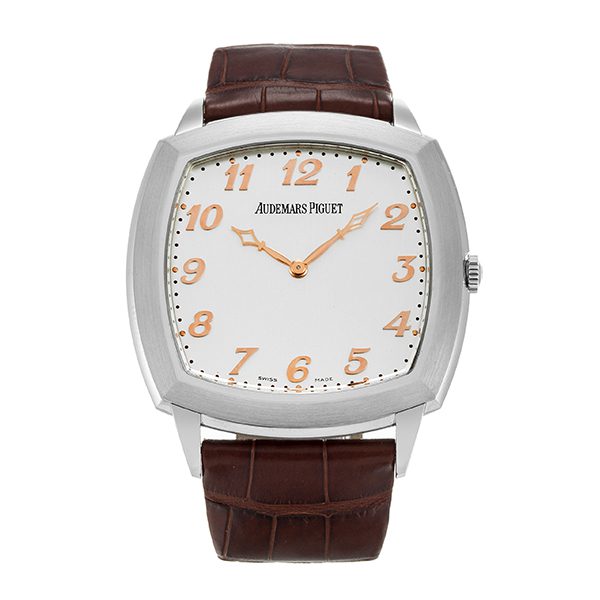 43 mm platinum case, silver dial, scratch resistant sapphire crystal, transparent case back, brown Leather strap, deployant buckle clasp, automatic movement.