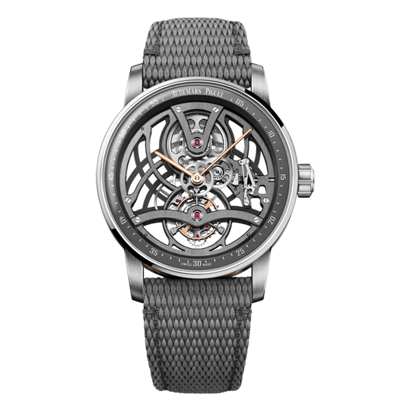 “The hand-finished tourbillon open worked movement adorning different shades of grey is housed in a two-tone case interweaving 18-carat white and pink gold, highlighting the watch’s multifaceted geometry.”