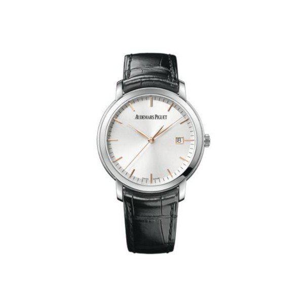 39.00mm 18K white gold case, sapphire crystal back, glare proofed sapphire crystal, silver dial with applied gold hour-markers and pink gold hands, automatic-winding Audemars Piguet Calibre 3120 movement with hours, minutes, center seconds, and date, approximately 60 hours of power reserve, hand-stitched large square scale black leather strap with 18K gold pin buckle. Water resistant to 20 meters.