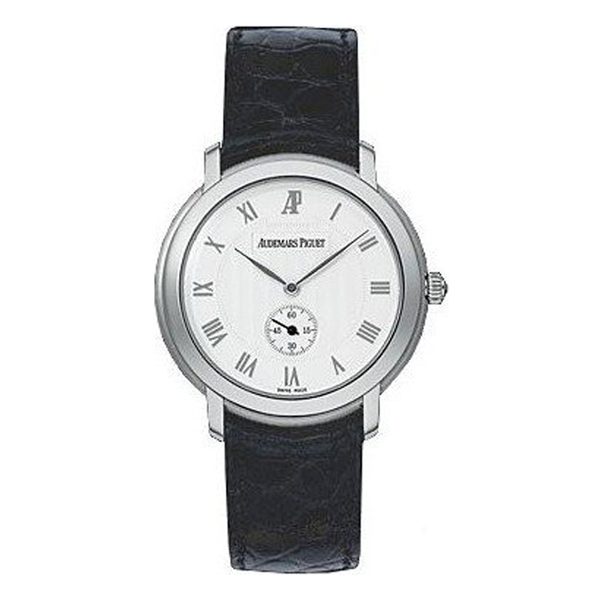 36 mm 18kt white gold case, white dial, scratch resistant sapphire crystal, solid case back, black leather strap, automatic movement, Pin & Buckle clasp, water resistant to 20m/65ft.