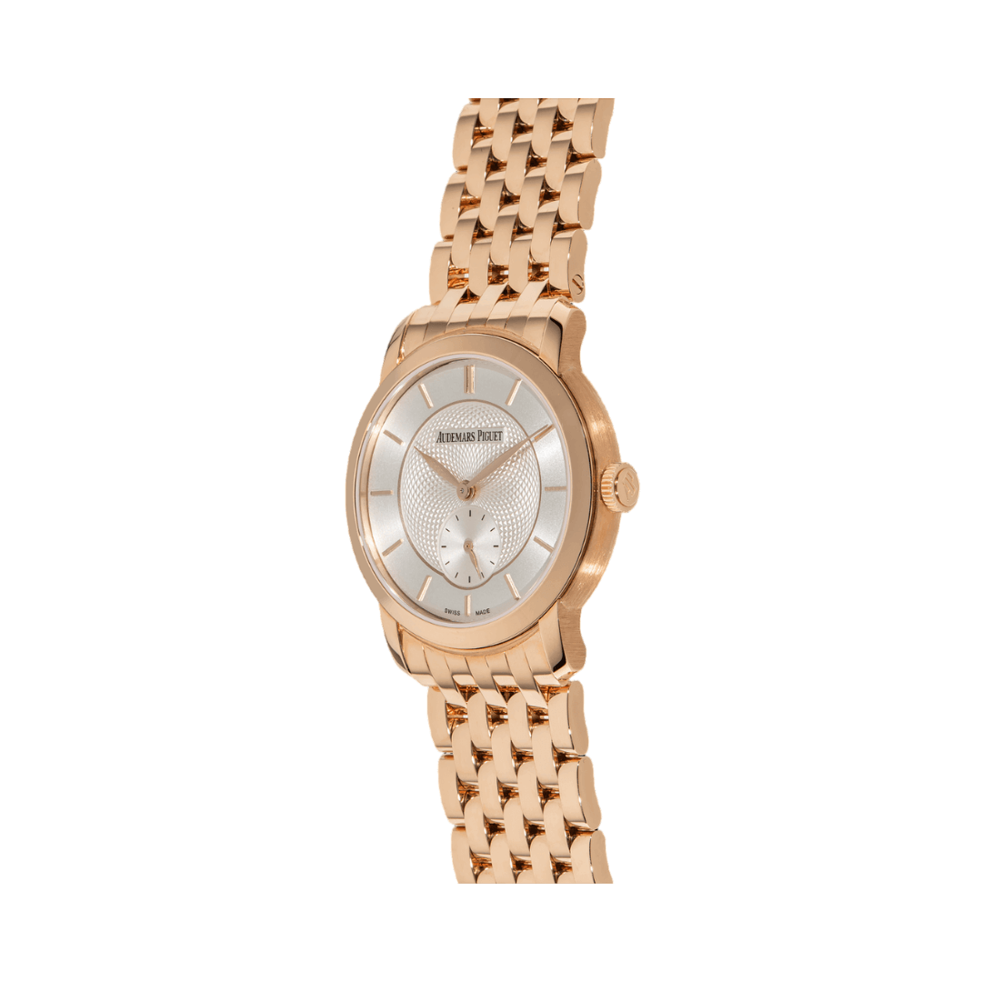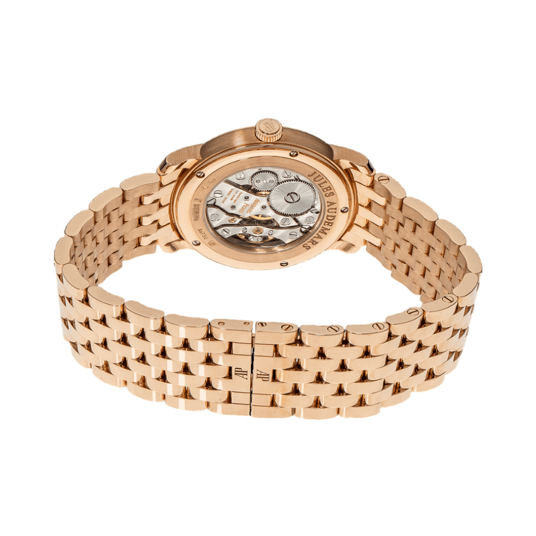 The Audemars Piguet Jules Audemars 77250OR.OO.1270OR.01 Ladies Watch is a beautiful blend of luxury and sophistication. This exquisite timepiece features a stunning 18 karat rose gold case that exudes elegance. The fixed bezel, also crafted from 18 karat rose gold, adds to the watch’s refined appearance.
