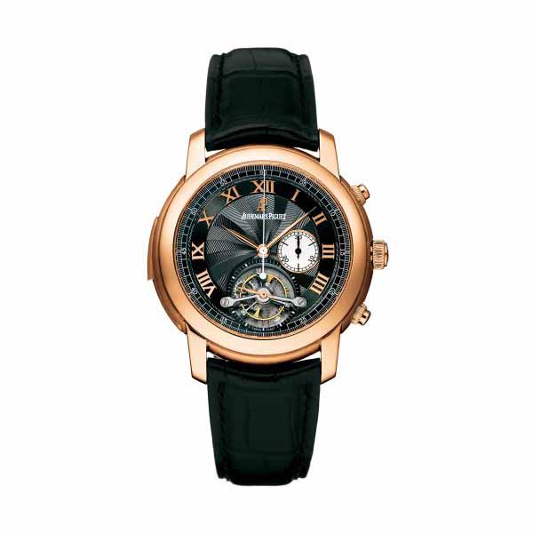 Hand-wound minute repeater watch with tourbillon, chronograph and small seconds at 6 o’clock. 18-carat pink gold case, black dial, black strap. 18-carat pink gold case, glareproofed sapphire crystal and caseback. Black sapphire dial with “spirale” decorative pattern, pink gold applied Roman numerals and hands. Hand-stitched “large square scale” black leather strap with 18-carat pink gold AP folding clasp. Our hand-wound watches are powered by winding the crown manually.