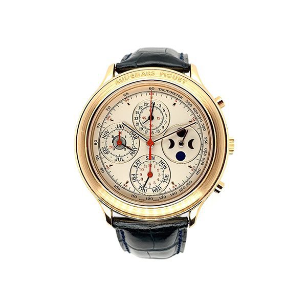 Functions: Perpetual calendar, small seconds and date counter subsidiary at 12 o’clock, moon phases sub-dial at 3 o’clock, day and 12-hour counter at 6 o’clock, month and 30-minute register at 9 o’clock, hours, minutes, Tachymeter scale, 38-hour power reserve