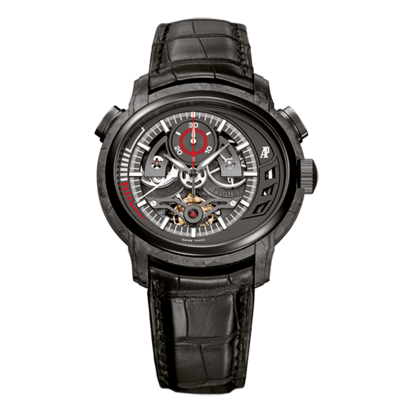 47mm X 42mm forged carbon case, skeleton dial, scratch resistant sapphire crystal, fixed bezel, transparent case back, black Leather strap, deployant buckle clasp, manual wind movement, water resistant to 20m/60ft.