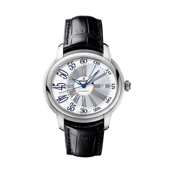 White lacquered dial, satin-brushed off-centred disc, blue printed Arabic numerals. White gold applied Roman numerals. Blued hands with luminescent coating. Hand-stitched “large square scale” blue leather strap with 18-carat white gold AP folding clasp. Powered by the natural movements of your wrist.