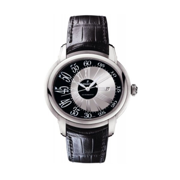Black lacquered dial, satin-brushed off-centred disc, grey printed Arabic numerals. White gold applied Roman numerals. White gold hands with luminescent coating. Hand-stitched “large square scale” black strap with 18-carat white gold AP folding clasp. Powered by the natural movements of your wrist.