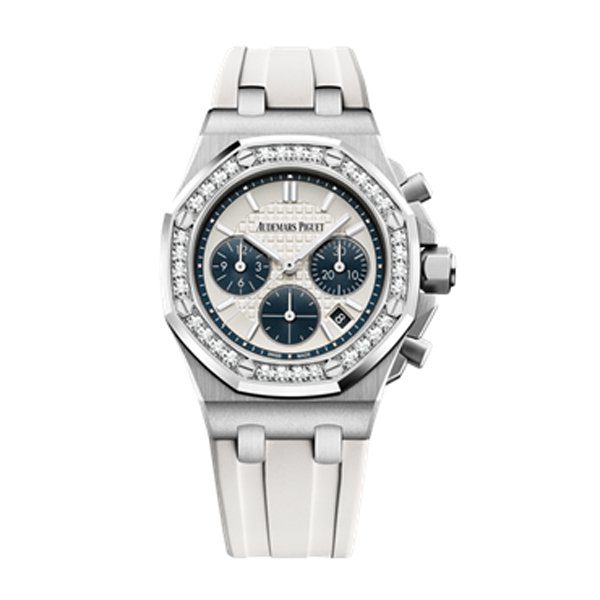 Complementing the stylish case is a white rubber strap with a stainless steel AP folding clasp, offering a secure and comfortable fit. The bezel of this watch is studded with 32 brilliant-cut diamonds weighing approximately 1.02 carats, making it an ideal pick for those who love an element of sparkle.