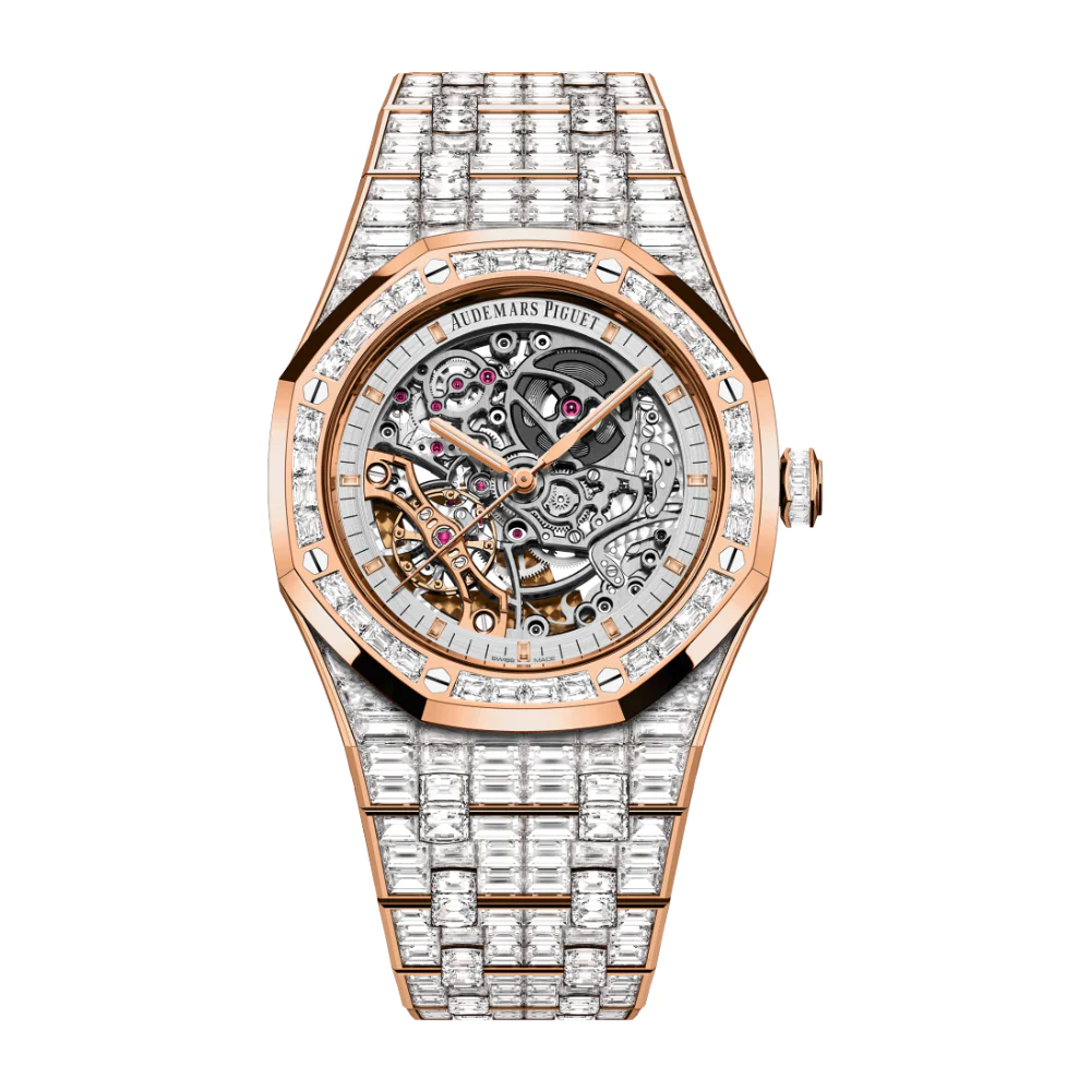 The skeleton dial of the Audemars Piguet Royal Oak 15417OR.ZZ.1267OR.01.A showcases the mechanical beauty of the watch. The gem-set indexes add a touch of glamour and elegance, enhancing the overall aesthetic appeal. The stick hands provide clear visibility and readability.