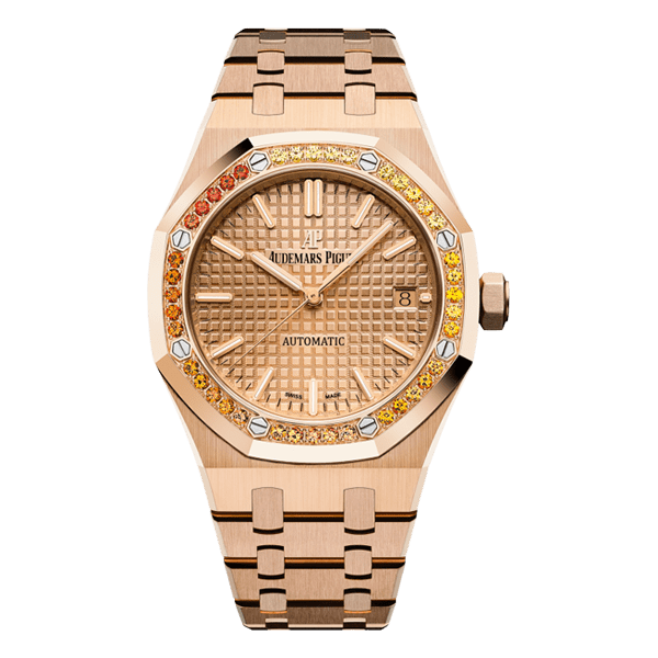 Audemars Piguet Royal Oak 15451OR.YY.1256OR.01 features 37mm 18kt rose gold case, gold dial, The case is mounted onto a matching bracelet in 18K rose gold, secured on the wrist with an AP folding clasp,