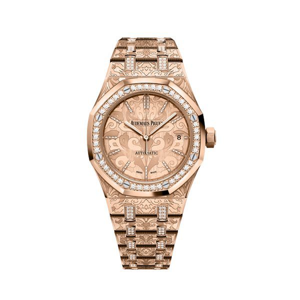 A special series based on the Selfwinding Royal Oak (37 mm), with 18-carat pink gold case and bracelet, entirely engraved with a “Cashmere” pattern and links set with brilliant-cut diamonds. 18-carat pink gold case, entirely engraved with a “Cashmere” pattern, glareproofed sapphire crystal and caseback, bezel set with brilliant-cut diamonds, screw-locked crown.