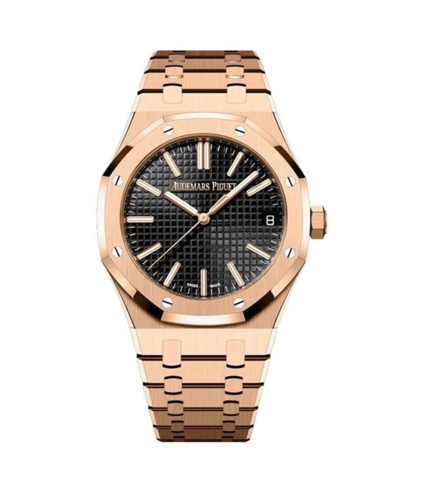 The Royal Oak 15510OR.OO.1320OR.04 features a 41mm case made of rose gold, giving it a distinct and lavish appearance. The rose gold case is complemented by a matching rose gold bracelet, adding to the watch’s overall allure. The black dial further enhances the timepiece’s sophistication, creating a striking contrast against the warm tones of the rose gold.