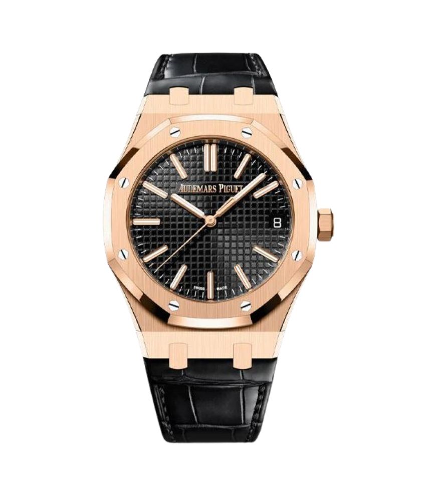 The 41mm case of the Audemars Piguet Royal Oak 15510OR.OO.D002CR.02 Men’s Watch is made of luxurious rose gold. The case is complemented by a fixed rose gold bezel, adding a touch of sophistication to the overall design. The black index dial enhances the watch’s sleek appearance and provides clear visibility of the time. The bracelet is made of black leather, providing both comfort and style. The fold-over clasp ensures a secure and comfortable fit.