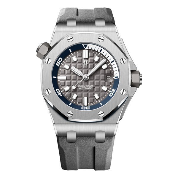 The 15720ST.OO.A009CA.01 features a stylish grey dial with white gold hands and indexes, complemented by a blue and white diving scale. The watch also includes grey ceramic crowns and a grey rubber strap. As a special touch, an additional blue rubber strap is included, providing versatility and style options.