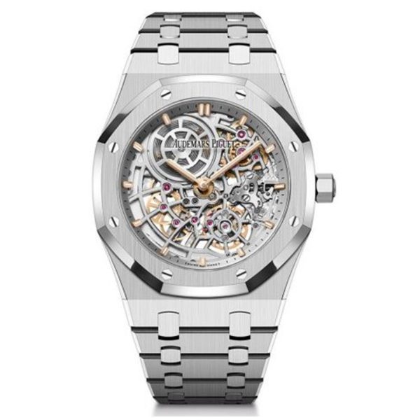Dial: Open-worked rhodium-toned dial, pink gold applied hour-markers and Royal Oak hands with luminescent coating.