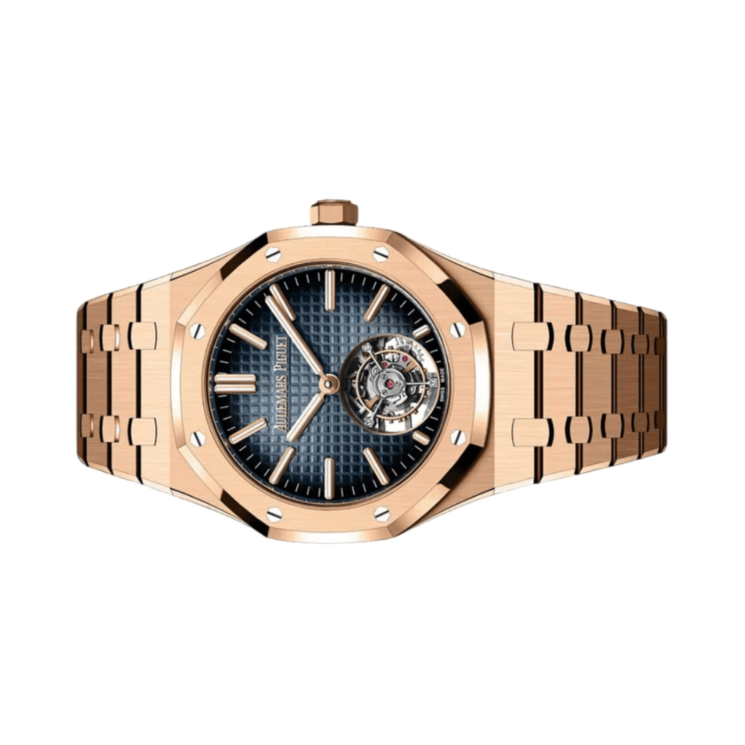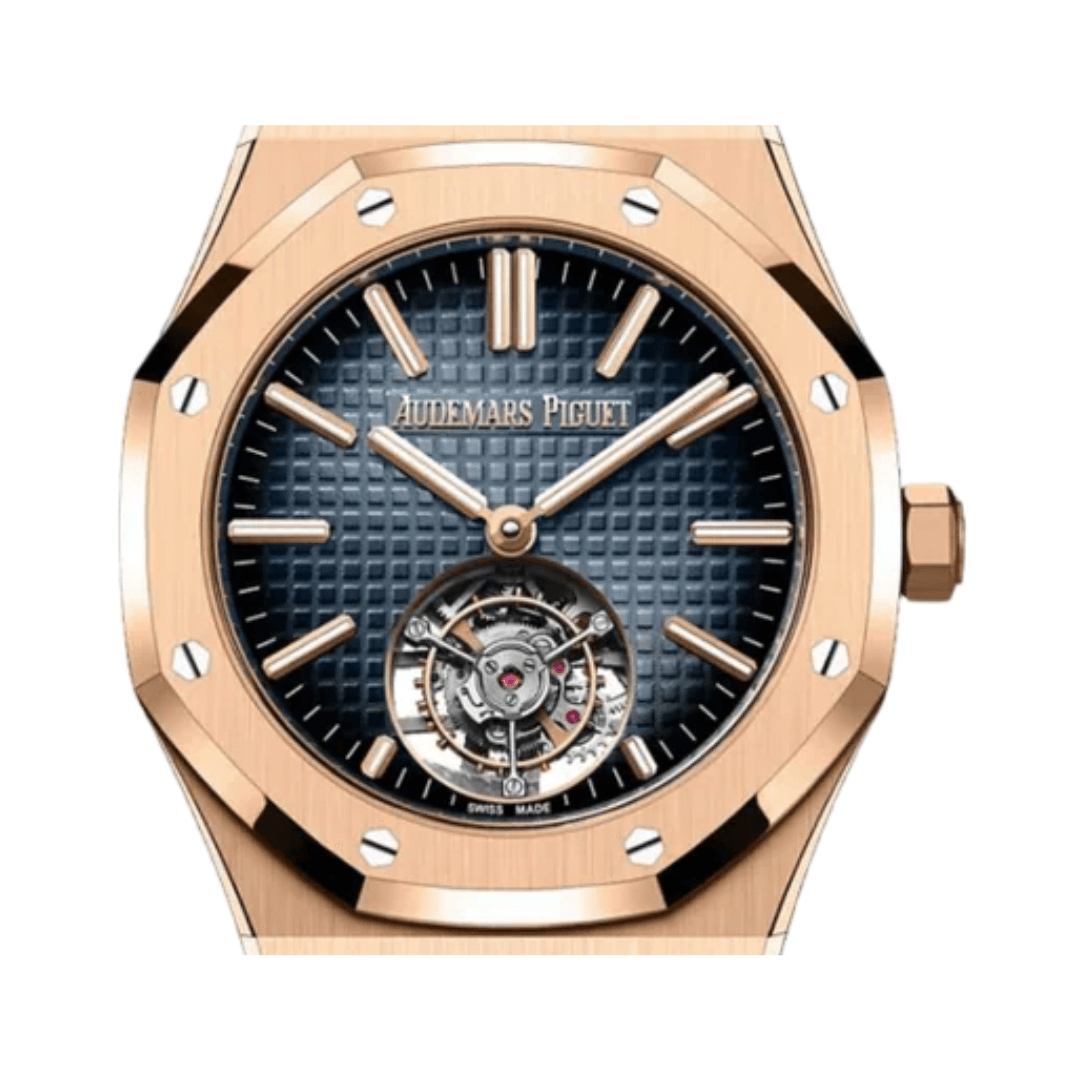 The Audemars Piguet Royal Oak 26730OR.OO.1320OR.02 is a luxury watch made to celebrate the 50th anniversary of the Royal Oak collection. It is crafted from 18-carat pink gold and has a case size of 41mm, giving it a rich and stylish look. The satin-brushed case with polished edges adds a special shine and elegance to the design.