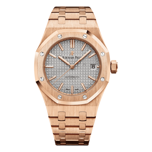 Dial: Nickel grey with Grande Tapisserie pattern, pink gold applied hour-markers, and Royal Oak hands with luminescent coating