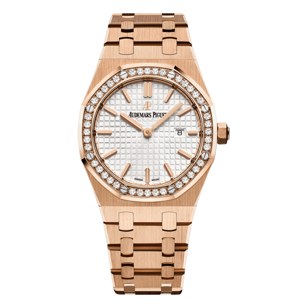 Dial: Silver with with “Grande Tapisserie” pattern, pink gold applied hour-markers and Royal Oak hands with luminescent coating, Date window located at the 3 o’clock position.