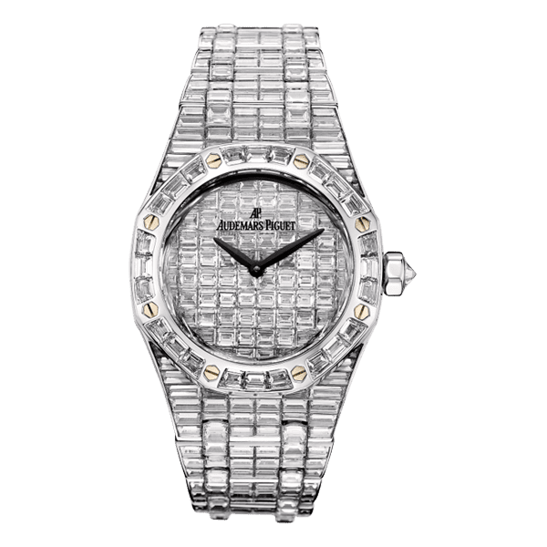 Baguette-cut diamond-paved dial, blackened gold hands. 18-carat white gold bracelet entirely set with baguette-cut diamonds with AP folding clasp. 441 baguette-cut diamonds, ~29.00 carats (case, bezel, crown, bracelet). 76 baguette-cut diamonds, ~4.85 carats (dial). Mechanical excellence combined with quartz brings superior accuracy.