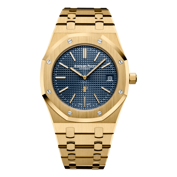 18-carat yellow gold case, glareproofed sapphire crystal and caseback. Blue dial with “Petite Tapisserie” pattern, yellow gold applied hour-markers and Royal Oak hands with luminescent coating. 18-carat yellow gold bracelet with AP folding clasp.