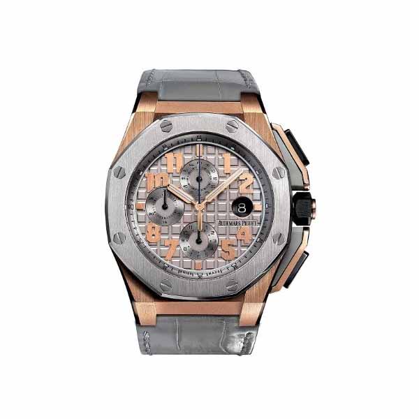 LBJ signature printed in blue on the sapphire crystal, titanium bezel, 44mm 18kt pink gold case, grey dial, automatic movement, bar-shaped hands, grey leather strap, chronograph lebron james function, water resistant to 100m/330ft.