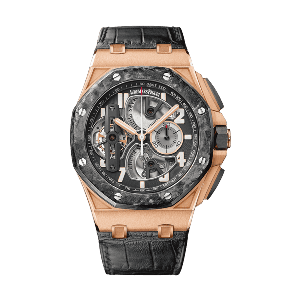 44mm 18kt rose gold case, 16.6mm thickness, octagon case shape, transparent case back, black tourbillon dial, power reserve 237 h, deployment clasp, black leather strap, fixed bezel, scratch resistant sapphire crystal, water resistant to 20m/66ft.