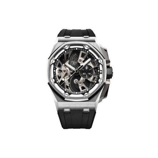 45mm stainless steel case, black dial, transparent case back, manual wind movement, black rubber strap, fixed bezel, scratch resistant sapphire crystal, tang clasp, water resistant to 100m/330ft.
