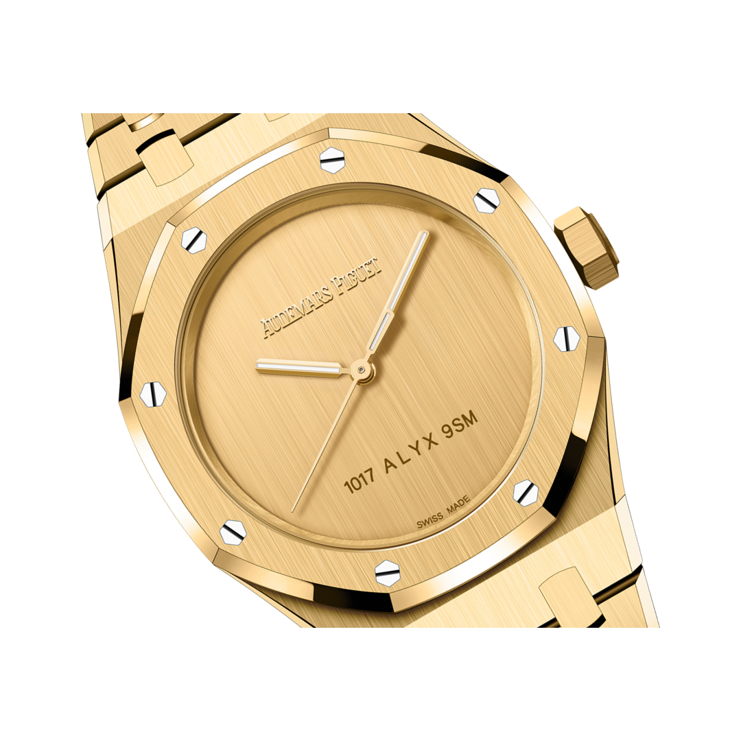The yellow gold dial features a vertical satin-finish with luminous Royal Oak hands. This elegant design ensures clear readability while maintaining a refined aesthetic.