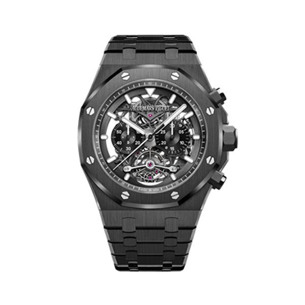 Openworked, satin-brushed black dial, black counters, white gold applied hour-markers and Royal Oak hands with luminescent coating, black inner bezel. Black ceramic bracelet with titanium AP folding clasp. Two additional rubber straps; one in two-tone rubber strap: black on top and grey on the sides and underside, another in full black rubber.