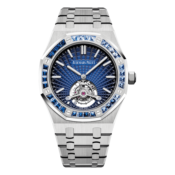 Dial Color: Smoked blue dial with “Tapisserie Evolutive” pattern, white gold applied hour-markers and Royal Oak hands with luminescent coating.