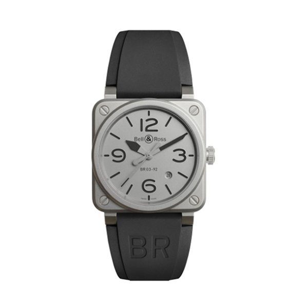 Limited Edition. Silver-tone microblasted steel case with a black rubber strap. Fixed silver-tone microblasted steel bezel. Grey dial with luminous grey sword-shaped hands and index hour markers. Arabic numerals mark the 3, 6, 9 and 12 o’clock position. Dial Type: Analog. Luminescent hands and markers. Date display between the 4 and 5 o’clock positions. Bell and Ross Calibre BR-CAL.302 Automatic movement, based upon Sellita SW300-1, containing 25 Jewels, bitting at 28800 vph, and has a power reserve of approximately 38 hours. Scratch resistant sapphire crystal. Pull / push crown. Solid case back. Square case shape, case size: 42 mm, case thickness: 9.8 mm. Tang clasp. Water resistant at 100 meters / 330 feet. Functions: date, hour, minute, second.