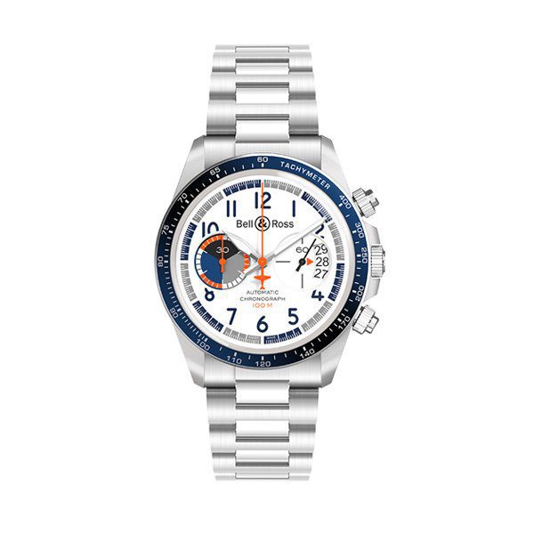 Limited Edition of 999 pieces. 41 mm in diameter. Satin-polished steel. Steel bezel with anodised blue aluminium ring and tachymeter scale. Screw-down crown and push-buttons. Sapphire case-back. Movement: calibre BR-CAL.301. Automatic mechanical. Functions: hours, minutes, small seconds and date at 3 o’clock. Chronograph: 30-min timer at 9 o’clock, central chronograph seconds. Dial: white. Blue painted numerals. Metal skeleton Superluminova-filled hour and minute hands. Crystal: ultra-curved sapphire with anti-reflective coating. Water-resistance: 100 metres. Strap: satin-polished steel. Buckle: folding. Satin-polished steel.