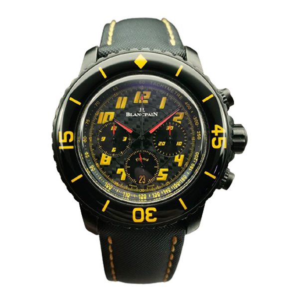 Bracelet: Black smooth leather strap with yellow stitching, Blancpain tang buckle