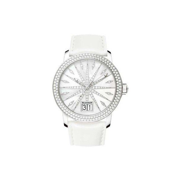 40mm 18kt white gold case, folding clasp, white leather strap, scratch resistant sapphire crystal, Mother of Pearl dial, automatic movement, diamond bezel, water resistant to 100m/330ft.