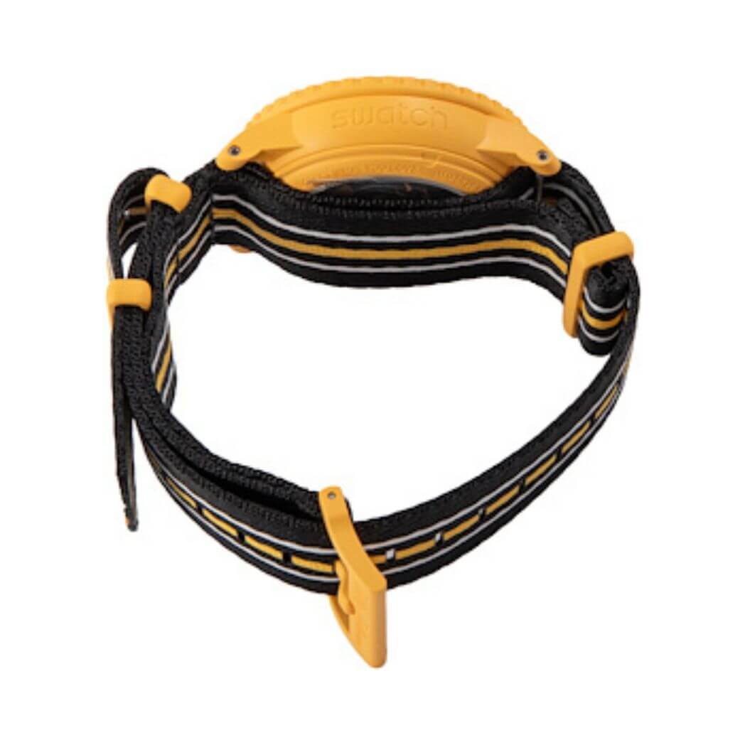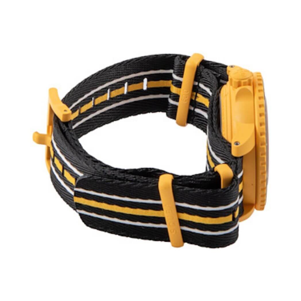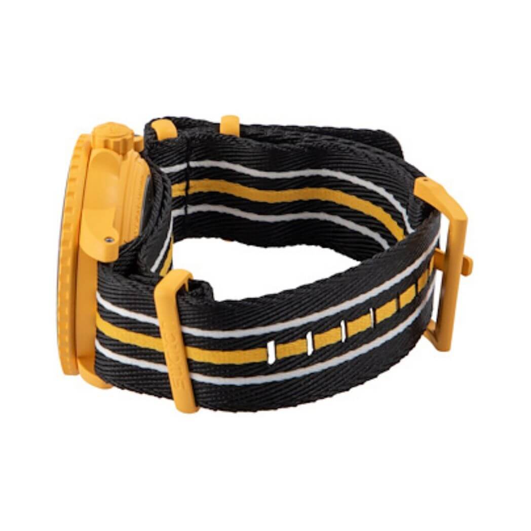 The yellow case and crown, both made of Bioceramic material, contribute to the watch’s robust build. The anti-scratch coated biosourced glass and one-direction rotating black Bioceramic bezel ensure resilience against the elements.