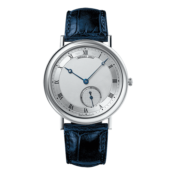 Breguet Classique 5140BB/12/9W6 features 40mm 18kt white gold case, 10.8mm thickness, silver dial, scratch resistant sapphire crystal, fixed bezel, solid case back, blue leather strap, tang buckle clasp, automatic movement, power reserve to 46 hours, water resistant to 30 meters / 100 feet.