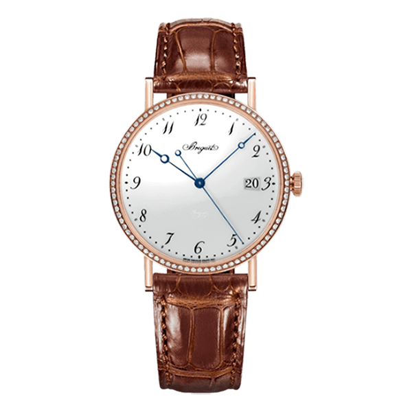 Breguet Classique 5178BR/29/9V6.D000 features 18-carat rose gold, with bezel set with 84 diamonds, approx. 0.634 ct. Self-winding movement with date. Balance spring, lever and escape wheel in silicon. White grand feu enamel dial. Breguet Arabic numerals. Secret signature. Sapphire caseback. Water-resistant to 3 bar ( 30 m ). Diameter : 38 mm. Also in white gold.