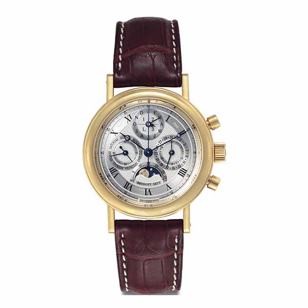 Breguet Classique 5617BA/1E/9V6 Perpetual Calendar Chronograph manual wind watch, features a 38mm 18k gold case surrounding a silver dial on a brown leather strap with original gold buckle. Functions include hours, minutes, seconds, day, date, month, chronograph, perpetual calendar, moon phase and leap year indicator.