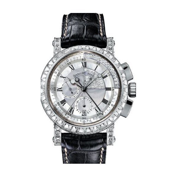 43 mm with 14.30 mm thickness, 18K white gold case material, mother of pearl dial, scratch resistant sapphire crystal, Leather strap, deployant buckle, automatic movement, 100m/330ft water resistance.