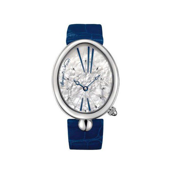 35.5mm X 43.75mm stainless steel case with the signature breguet coined edge, 9.45mm thick, transparent back, stainless steel bezel, scratch resistant sapphire crystal, mother of pearl dial, caliber 591c automatic movement, approximately 38 hours of power reserve, blue leather strap, deployant buckle. Water resistant to 30 m (100ft).
