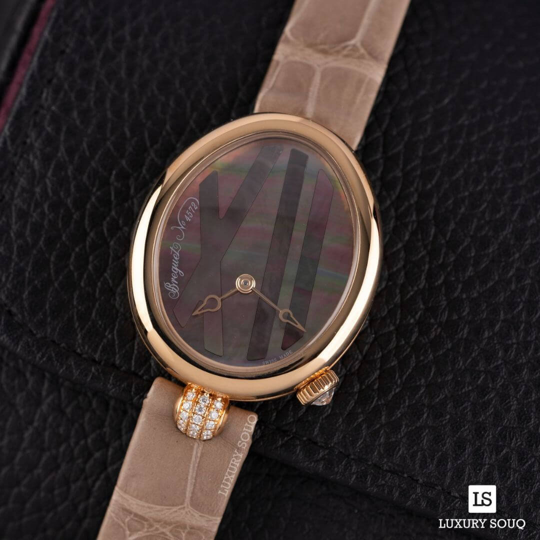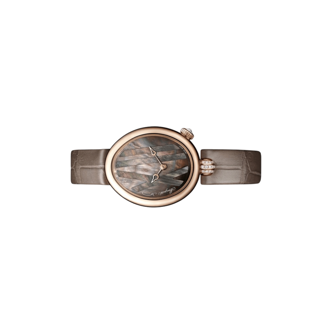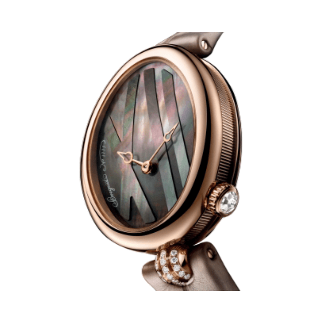 The Breguet Reine de Naples 9808BR/5T/922/0D00 is a sophisticated women’s watch crafted for elegance and style. The oval-shaped case is made from 18K rose (pink) gold, adding a touch of luxury. Its mother-of-pearl dial gives it a refined and timeless look.