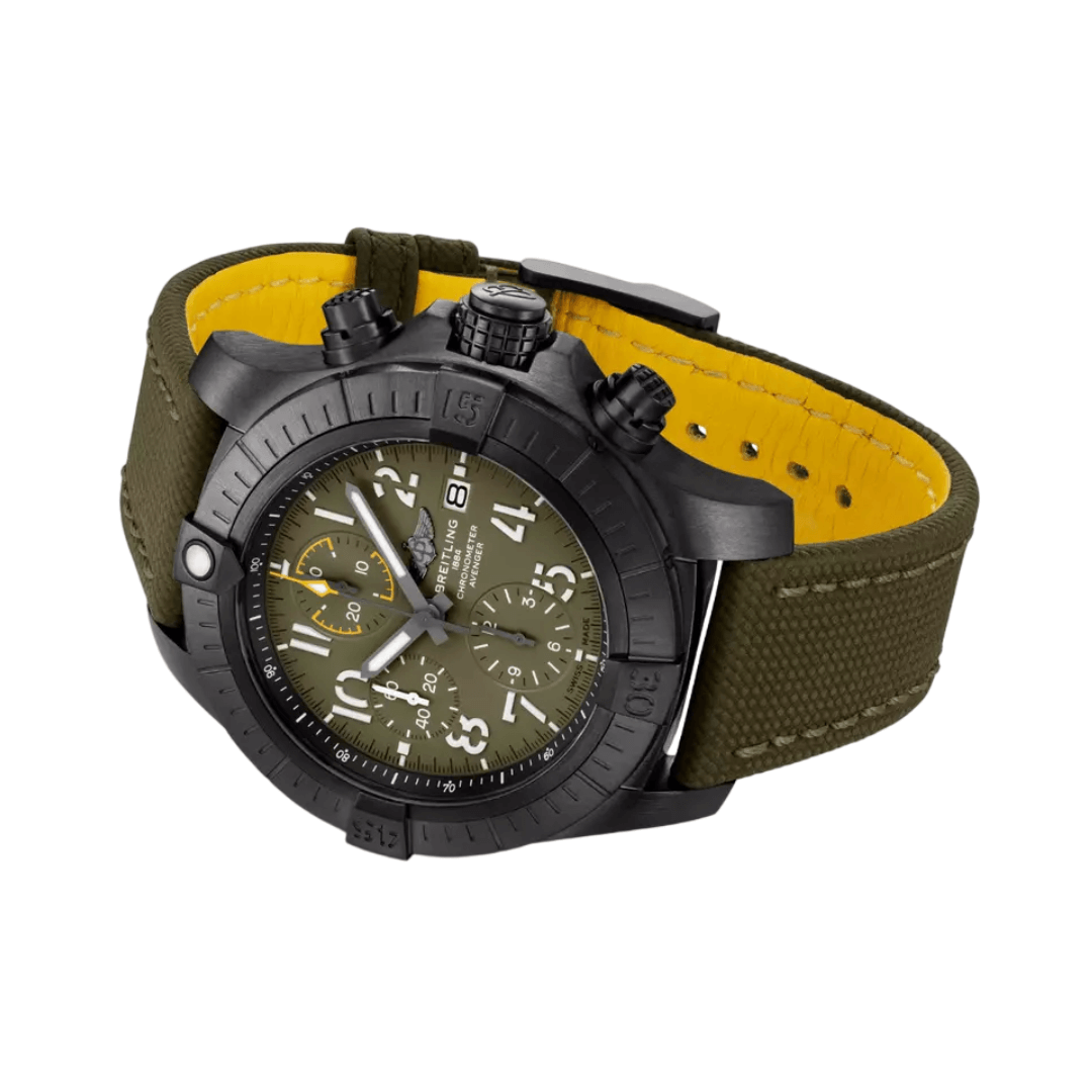 This Breitling Avenger watch is made with a solid titanium case, known for its lightweight yet tough build. The case measures 45 mm in diameter and has a thickness of 16.4 mm, providing a bold look on the wrist. The unidirectional rotating bezel in black adds both style and functionality, making it easier to track time accurately. It’s an excellent watch for those who enjoy outdoor activities or need a reliable timepiece that doesn’t compromise on quality.