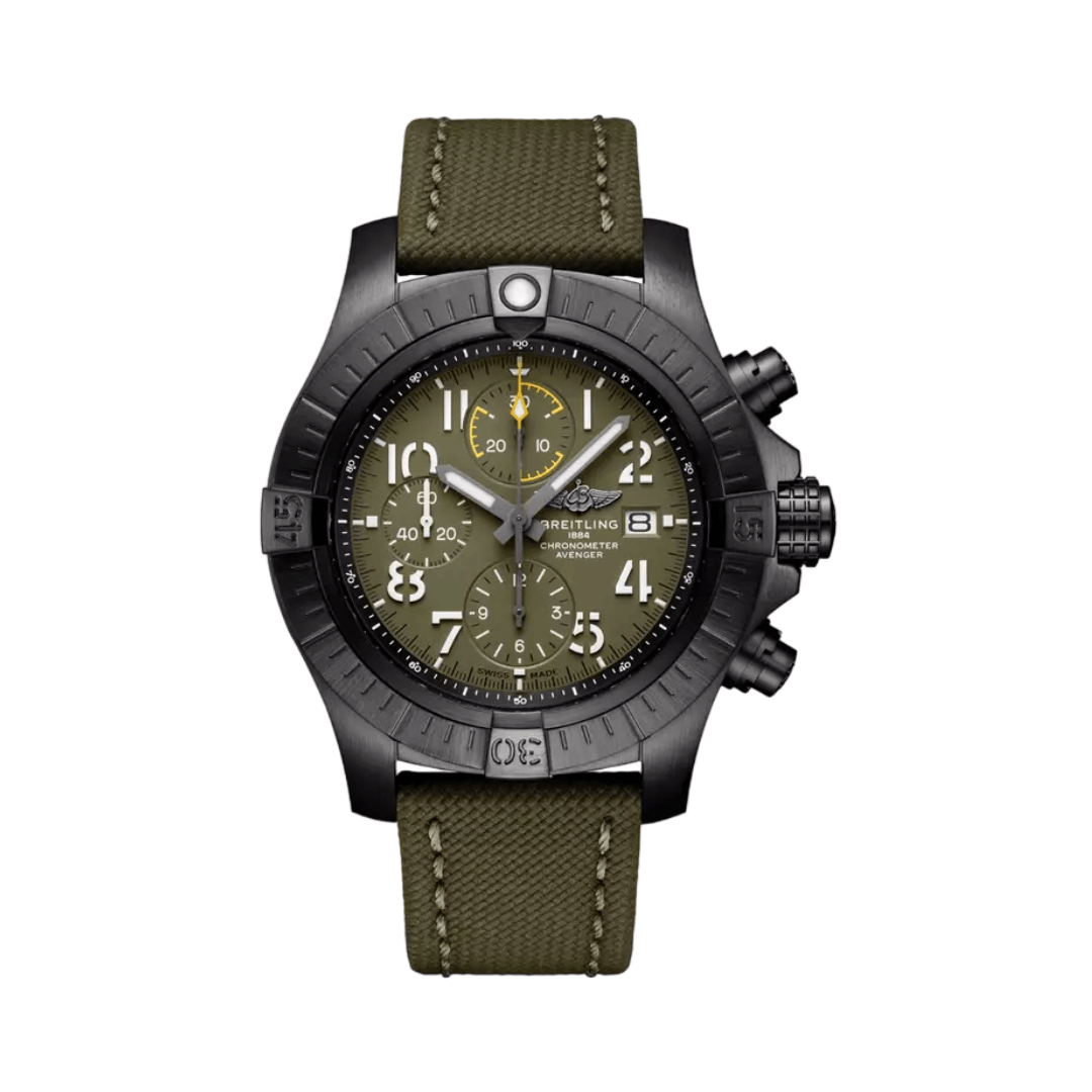 The Breitling Avenger V13317101L1X2 Chronograph Night Mission 45mm Men’s Watch is crafted for those who love both style and adventure. This model stands out with its robust and striking design, combining a green leather strap with a black titanium case. Designed to handle intense conditions, this watch offers the reliability and durability you need in every situation.