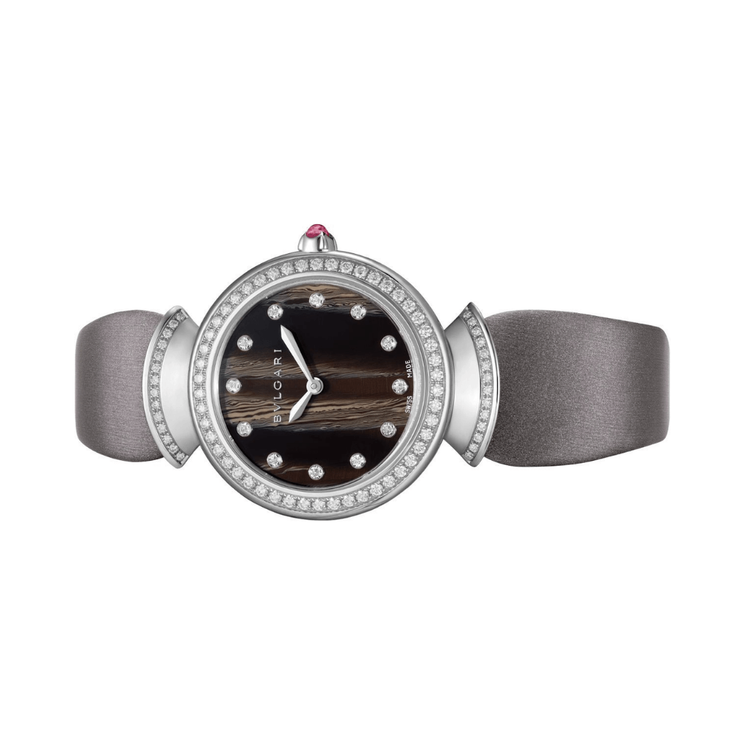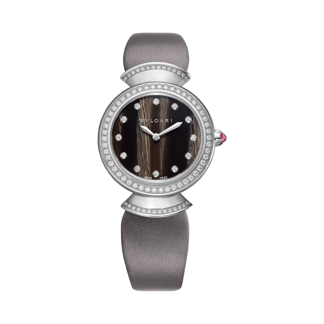 The Bvlgari Diva 102434 DVW30BGDL/12 is a beautiful women’s watch crafted with fine materials and delicate design. The watch features a 30mm round case made of 18kt white gold, which adds a classic and luxurious feel. Its black dial is detailed with sparkling diamond indexes and elegant sword-shaped hands, giving it a graceful and stylish look.