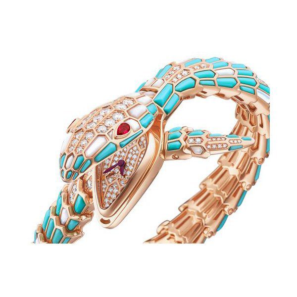 40 mm 18 kt rose gold curved case and dial set with brilliant cut diamonds and mother-of-pearl elements, 18 kt rose gold bracelet set with brilliant cut diamonds, turquoise and mother-of-pearl elements, eyes in rubies, quartz movement, fixed bezel, scratch resistant sapphire crystal, Playing with the mystery of the sacred animal, the watch unveils under its precious snakehead the secret pleasure of time.