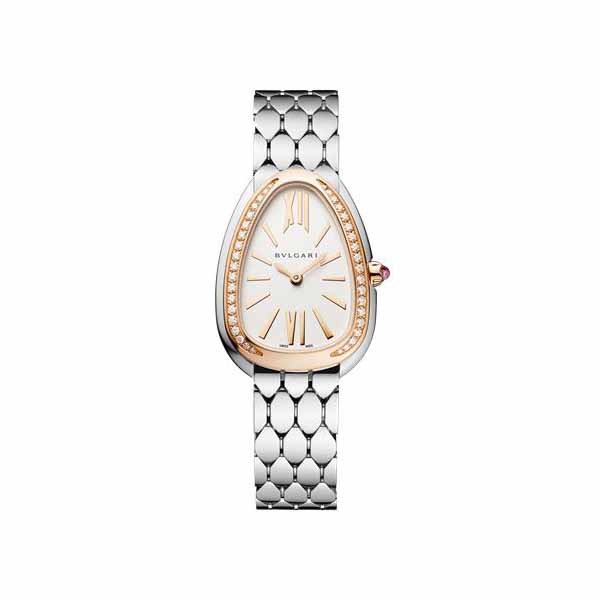 33mm stainless steel/18k rose gold case, diamond bezel, scratch resistant sapphire crystal, deployment buckle clasp, white silver opaline dial, water resistant to 30m/100ft.