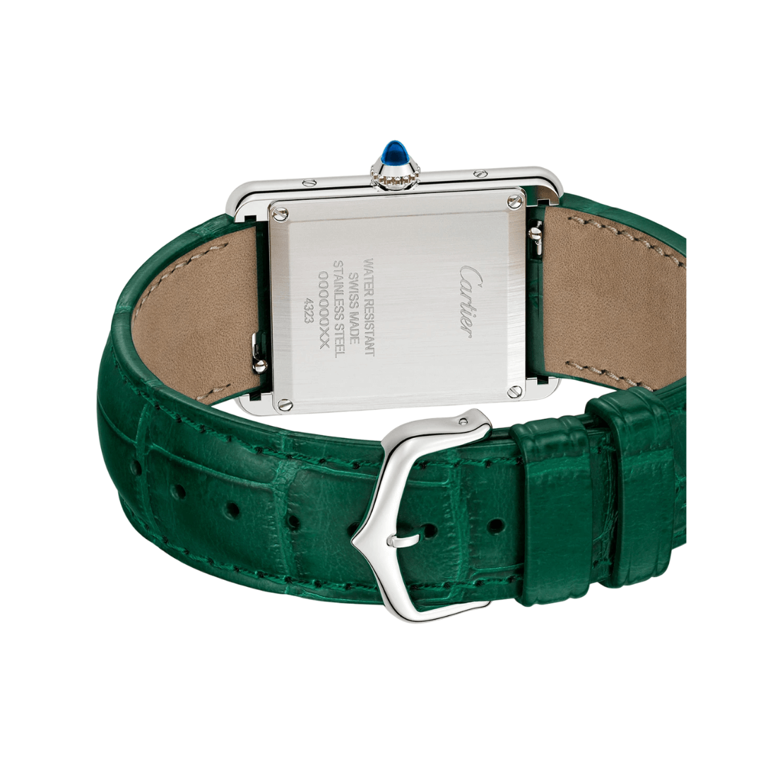 The Cartier Tank WSTA0056 Quartz watch is a stunning timepiece for ladies, combining elegance and functionality. Its large model features a bold green lacquered dial with polished steel sword-shaped hands that create a classic and sophisticated look.